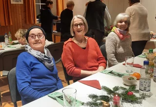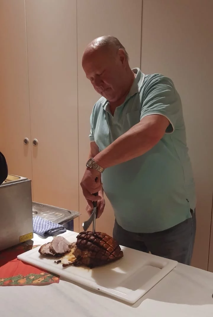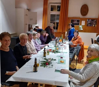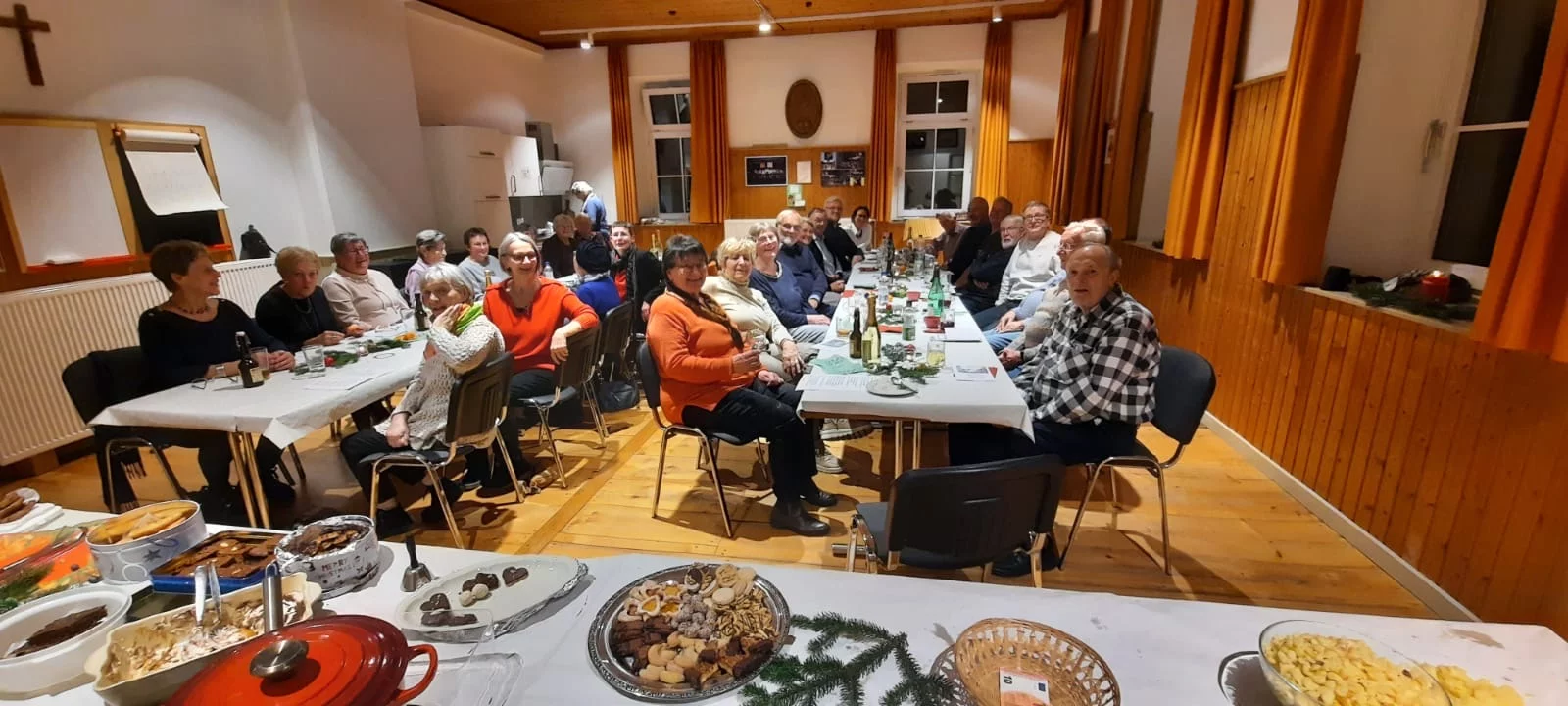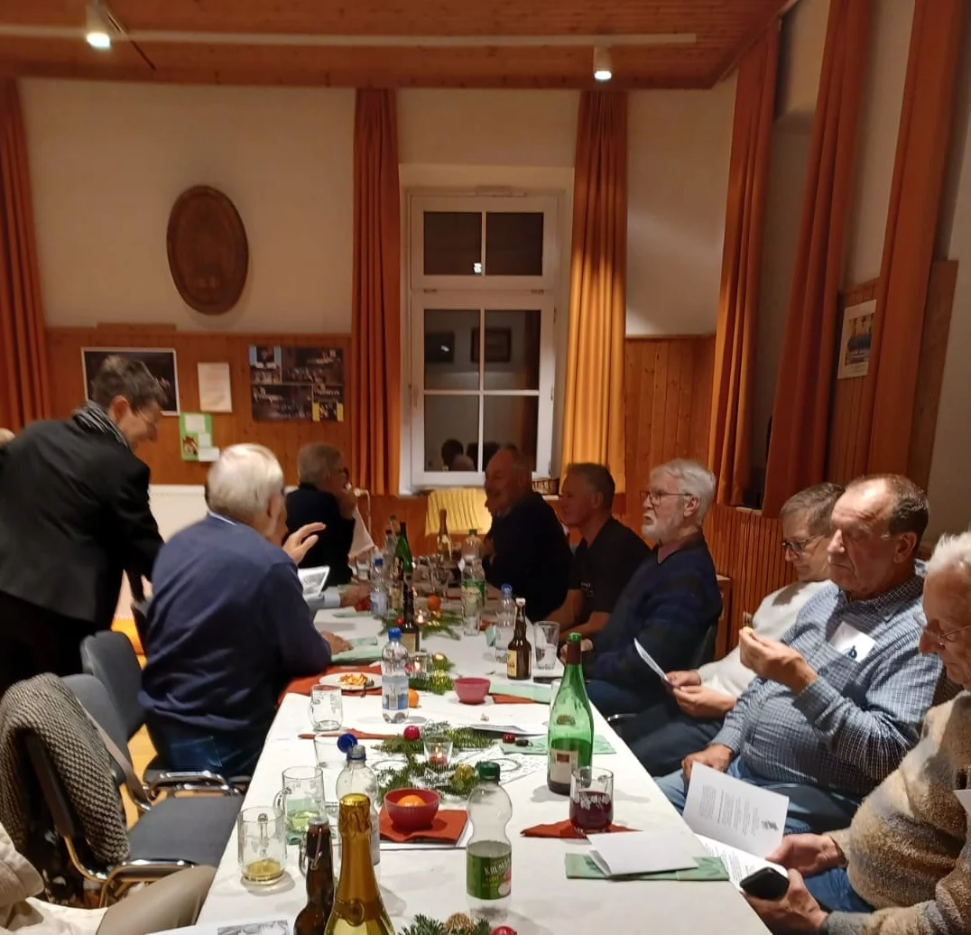 Alle Jahre wieder wird der Probenraum zu mehreren festlichen Tafeln umfunktioniert, um beim fröhlichen Beisammensein unser "Sängerjahr" zu beschließen und die Jubilare unseres Vereins zu feiern. Diesmal war es ein fröhlicher Kameradschaftsabend mit "saumäßig" gutem Essen - einem tollen Krustenbraten mit Spätzle, Soß' und Kartoffelsalat sowie vielen feinen Salaten. Abschließend wurde Süßes in allen Variationen aufgetischt.